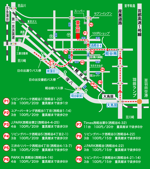 | ■童具館には専用の駐車スペースがございませんので、公共の交通機関でいらしていただくか、近くの有料駐車場をご利用下さい。 |