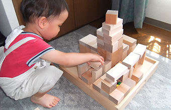 また、積み木の量が足りないと遊びの手の、もっと積んでみたいという気持ちが止まってしまうので、少し多めの量を置いておくことが大切です。